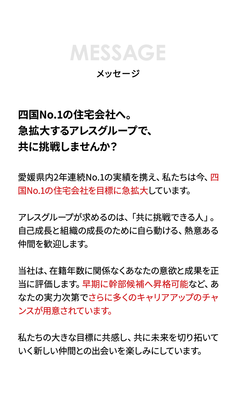 | 勤務地・勤務時間 | ◇勤務時間 9:00~18:00(休憩60分) ◇勤務地 ・アレスホーム松山西店 ・アレスホーム松山東店 ・アレスホームマサキデッキ店 ・アレスホーム 今治店 ・アレスホーム新居浜・西条店 ・アレスホーム南予・大洲店 ・ステラスホーム松山店 ・エルシーホーム 松山店 ・エルシ―ホーム今治店 ・ワイズホーム 松山店 |