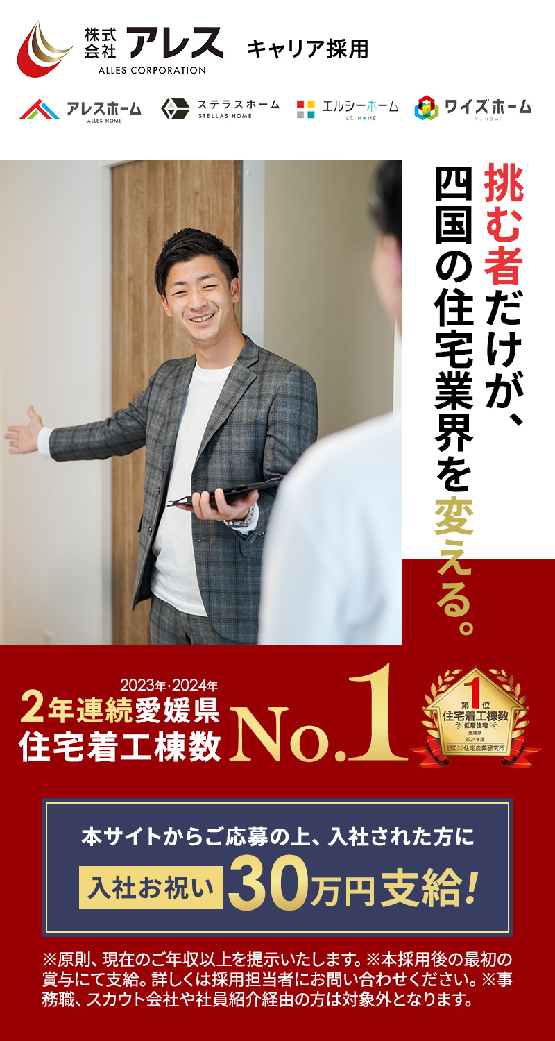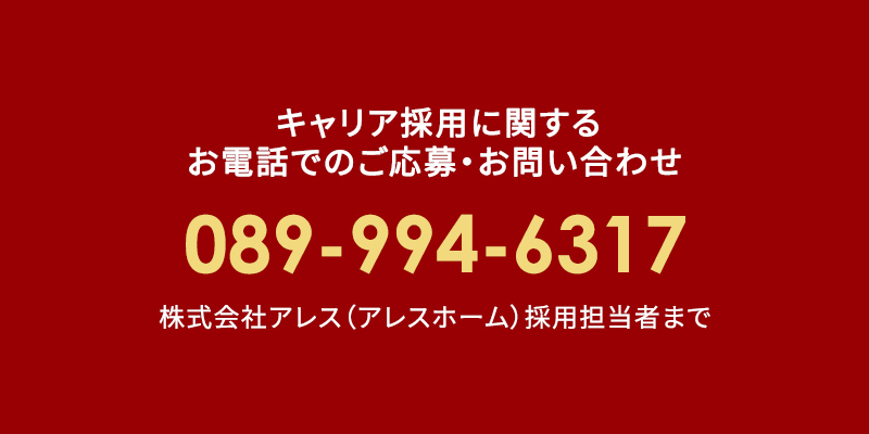 | 備考 | 担当者:玉井 ------------------------------------ 電話番号:089-994-6317 FAX:089-994-6318 Eメール:saiyo@alles-home.jp |