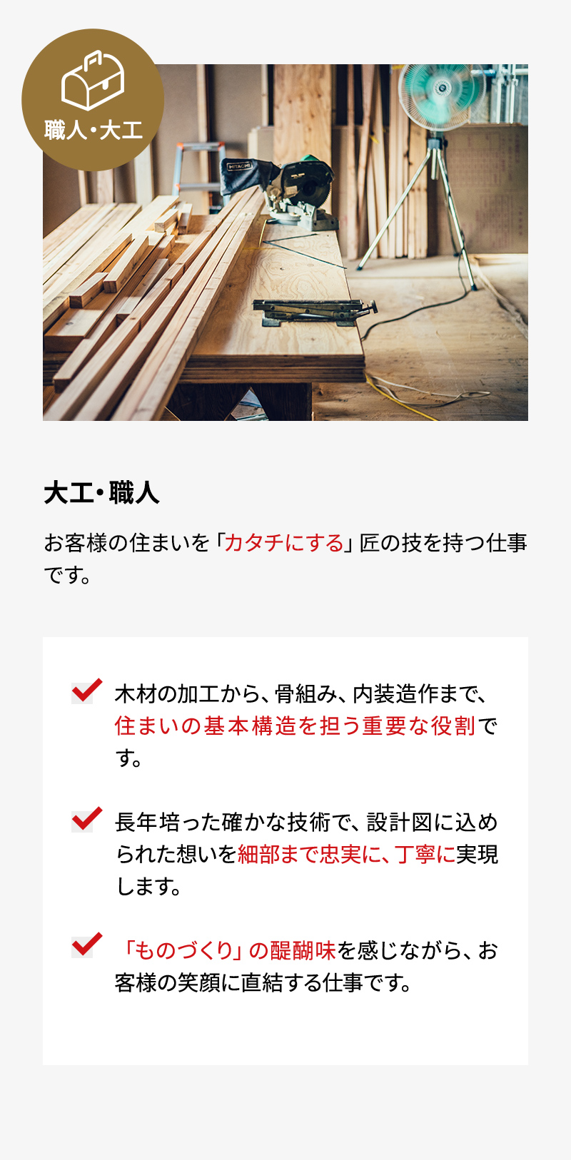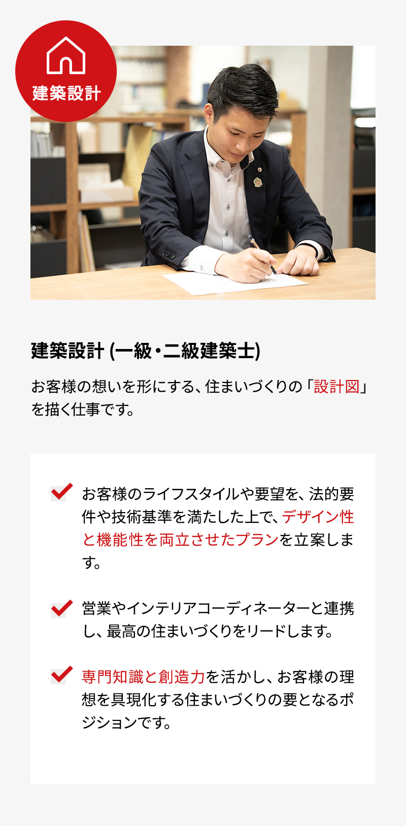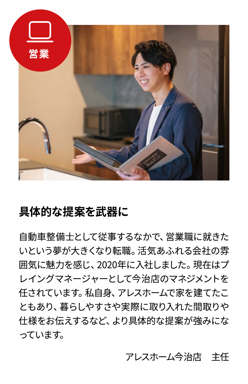実際に店舗やモデルハウスに訪れたお客様のご要望をお聞きし、設計職やインテリアコーディネーターと一緒にプランを作成、ご契約を頂くという、新築住宅や建築に関する接客やコンサルティング営業を行う仕事です。営業フローやツール、研修などの仕組みが整備されているので住宅の知識がなくても活躍できます。