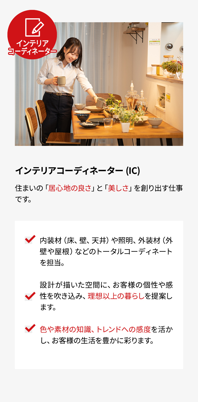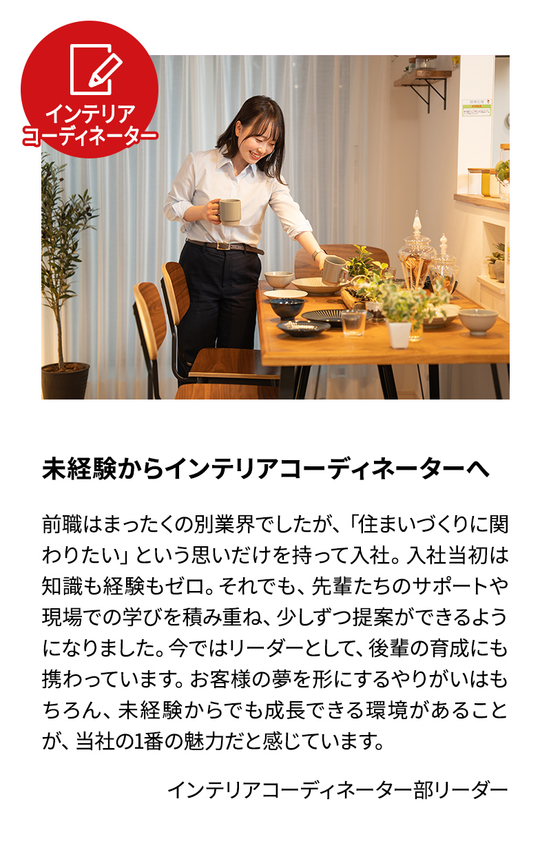 お客様の好みやライフスタイルに合わせて、内装のデザインやカラーコーディネートをトータルに提案する仕事です。 お客様の味方な存在で、メリットやデメリットも踏まえてしっかりご提案していきます。 流行りのものにも敏感に。情報収集を怠りません。