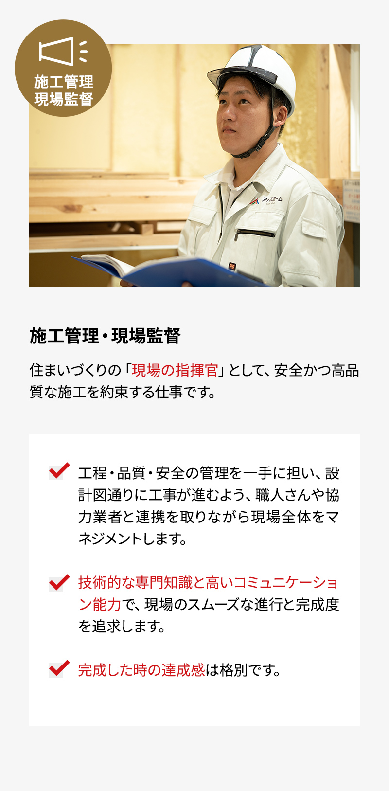 注文住宅戸建ての建築の施工管理を担っていただきます。 現場を監督する立場として施工計画を立て、品質管理・工程管理・原価管理・安全管理を基本業務とします。 工程表やツール、管理システムなどの仕組みが整備されているので住宅の知識がなくても活躍できます。