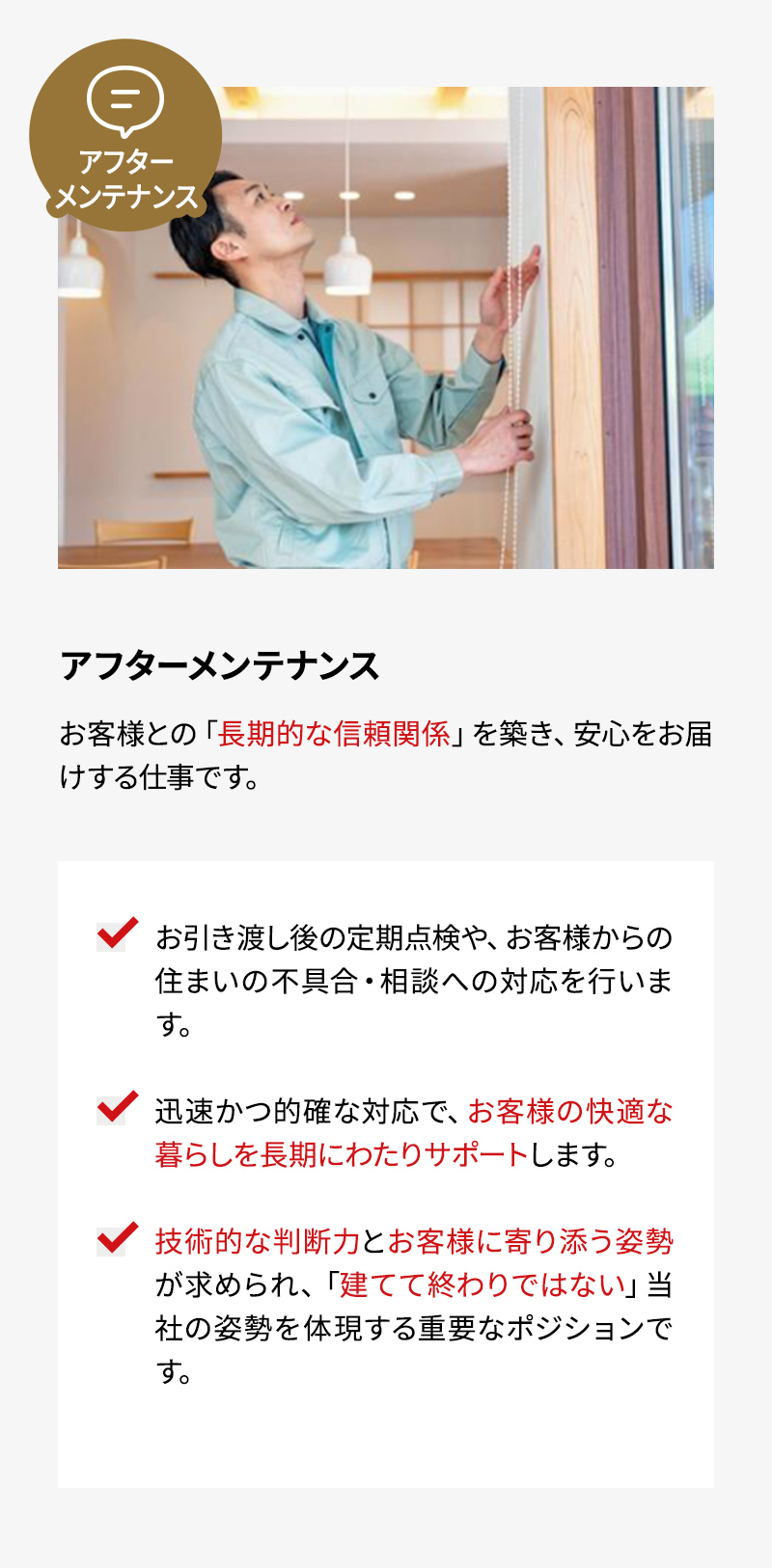 引き渡し後の住宅で発生する不具合等に関するお客様からの問い合わせに対応する業務をお任せします。 【具体的な業務】 ・定期点検後の不具合箇所の補修について業者依頼 ・お客様への連絡、アポ取り ・補修対応後の現場確認