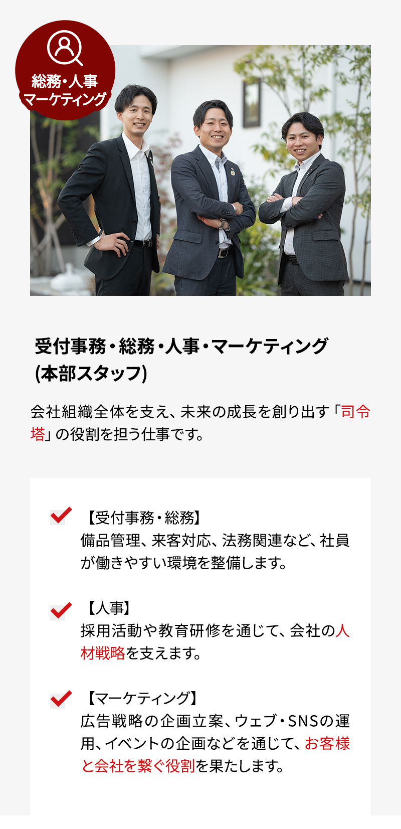 | 福利厚生 | 有給休暇・誕生日休暇・結婚記念日休暇 産前・産後休暇・育児休暇制度・出産お祝い金 表彰制度・スポーツ大会・BBQ・部活動・社員旅行 |
