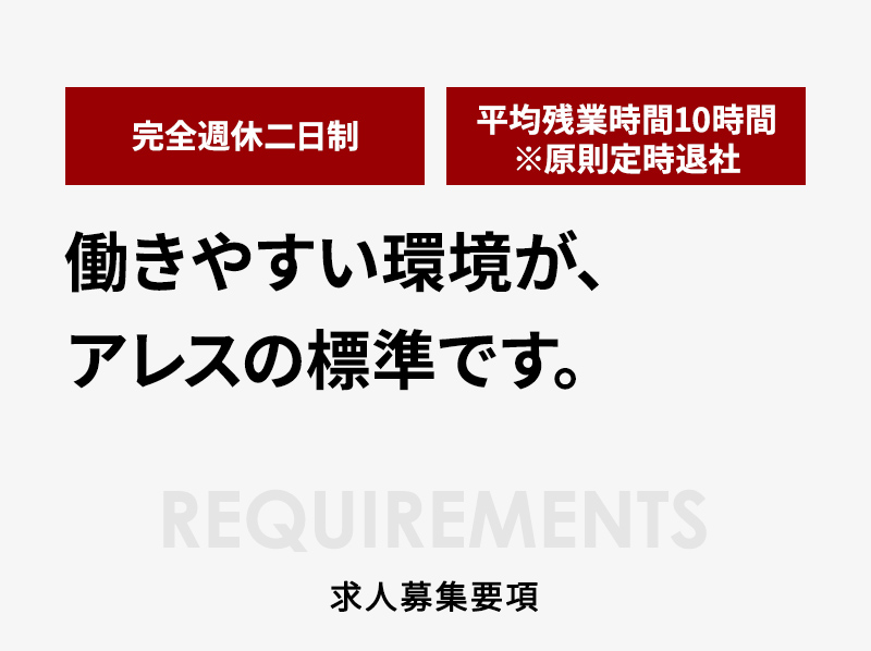 | 休日休暇 | 年間休日114日(定休日:土曜日・日曜日) 有給休暇:6ヶ月経過後の年次有給 GW・夏季休暇・年末年始・誕生日休暇・結婚記念日休暇 |