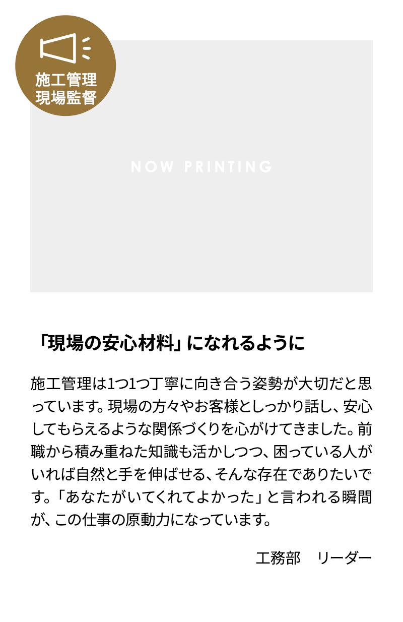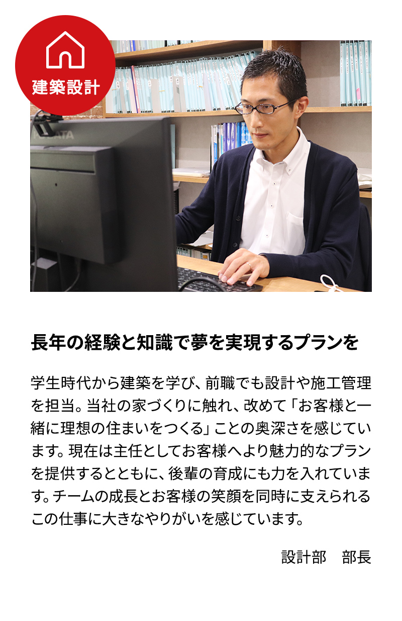 お客様からのご要望やイメージに合わせて、営業と共に最適なプランを作成し、ご契約を頂きます。そして発注から最終的な引き渡しまでを、トータルに手掛けます。